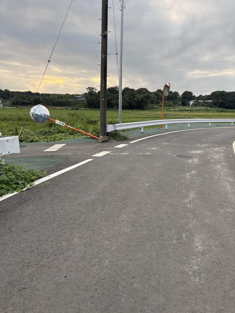 T字路のカーブミラーの角度が変わっており、カーブ先の状況が確認できない。